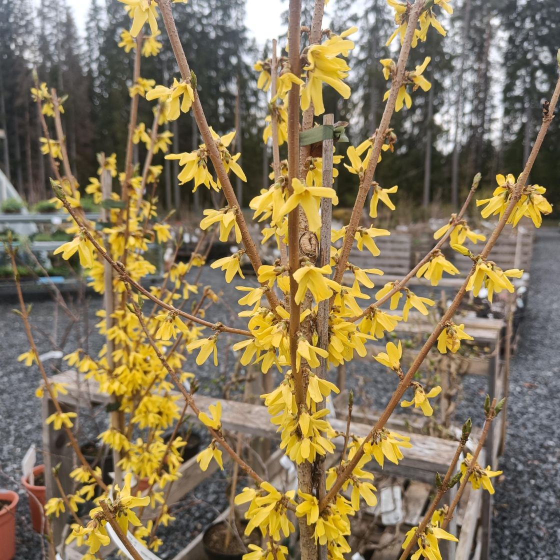 Keväällä ennen lehtien puhkeamista keltaisena kukkiva pikkupuu / VAIN NOUTO