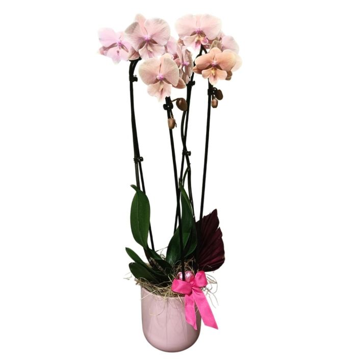 Hinta sisältää kaareen kasvatetun perhoskämmekän ihastuttavassa puuterisen vaaleanpunaisessa sävyssä. Ruukku on vaaleanpunainen ja koko istutus on koristeltu palmunlehdellä, maitosuklaasydämillä ja rusetilla. Todellinen katseenvangitsija!