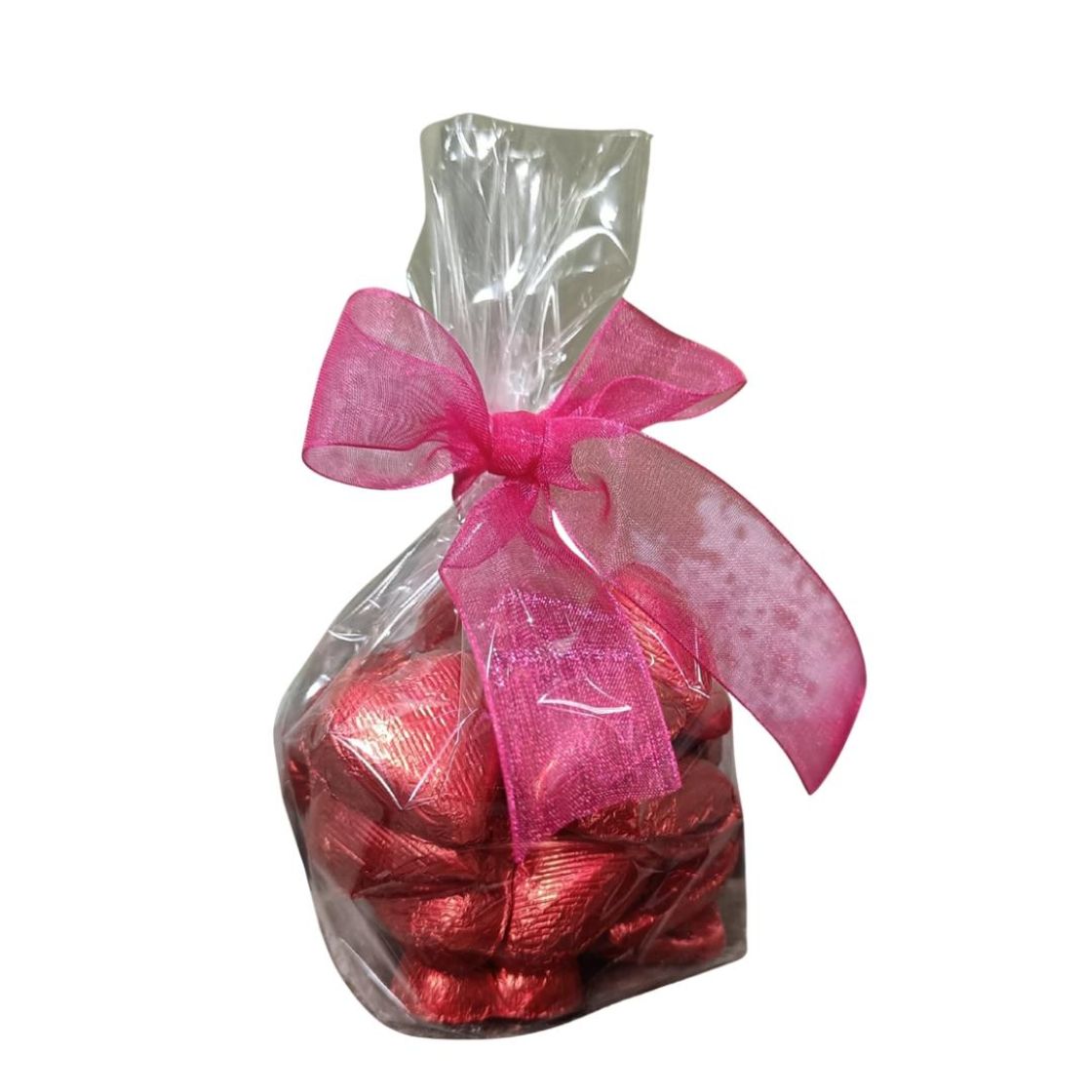 Punaiseen kääreeseen pakatut maitosuklaasydämet vaikka kukkalahjan kylkeen
