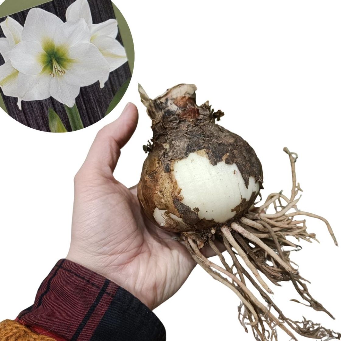 Amaryllikseksikin kutsutun, valkokukkaisen joulukukan sipuli / Emme tiedä lajikkeen nimeä