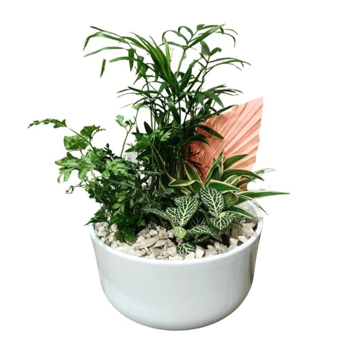 Valkoiseen keramiikka-astiaan istutettu neljän viherkasvin kokonaisuus. Viherkasvilajit saattavat vaihdella, mutta istutuksen yleisilme pysyy kuvanlaisena. Kasvit on valittu niin, että niillä on samankaltaiset olosuhdevaatimukset. Istutuksen multapinta on katettu koristekivillä ja istutus on somistettu palmunlehdellä.